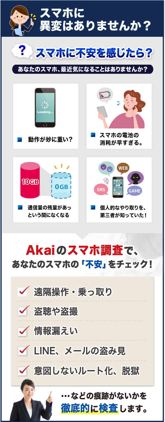 そんなスマホ端末の安全性を確保するため、弊社では、スマホ盗聴の発見PROのスマートフォンセキュリティチェックサービスをご用意しております。
